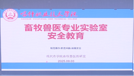 为强化学生实验室安全意识,规范操作流程,防范安全事故发生,喀什职业技术学院现代农学院畜牧兽医教研室于2025年9月3日,为2024级畜牧兽医专业1-8班全体学生开展实验室安全教育入学培训,培训由教研室主任赵天枝统筹,唐开婷、房华两位老师主讲。